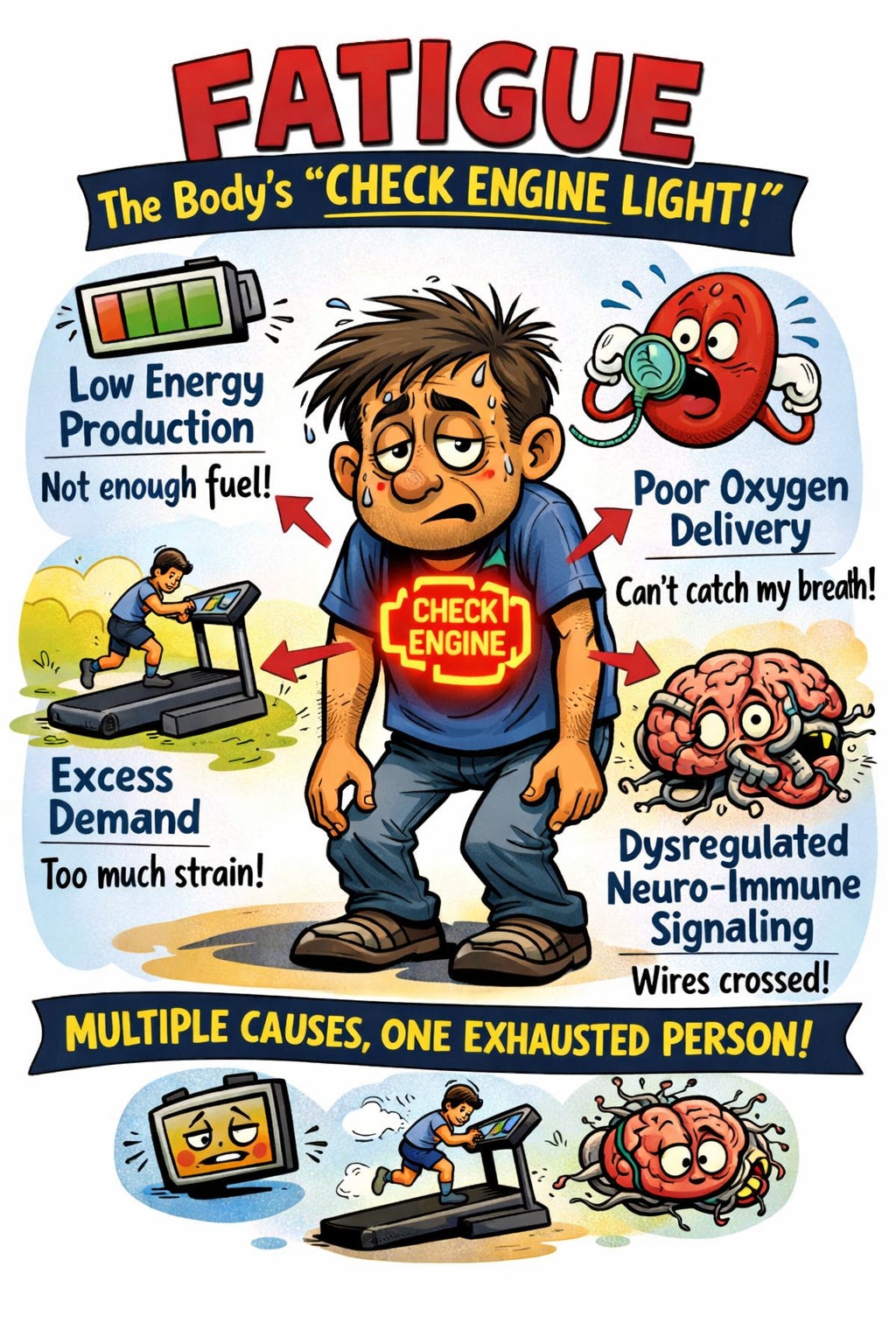 Fatigue is the body’s “check engine light.” It can mean low energy production, excess demand, poor oxygen delivery, or dysregulated neuro-immune/autonomic signaling—and the same person can have more than one mechanism at once.